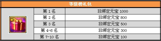 【活动内容】开服第7天24:00时,等级前十名的玩家将会得到珍贵的非绑定元宝!千载难逢的机会,速速向上爬吧!排名越高,奖励越丰盛呦。